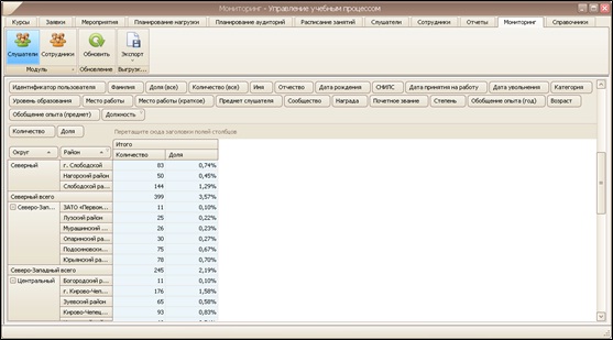 Формирование аналитических выборок по различным показателям, как среди учитываемых слушателей, так и среди собственных преподавателей.